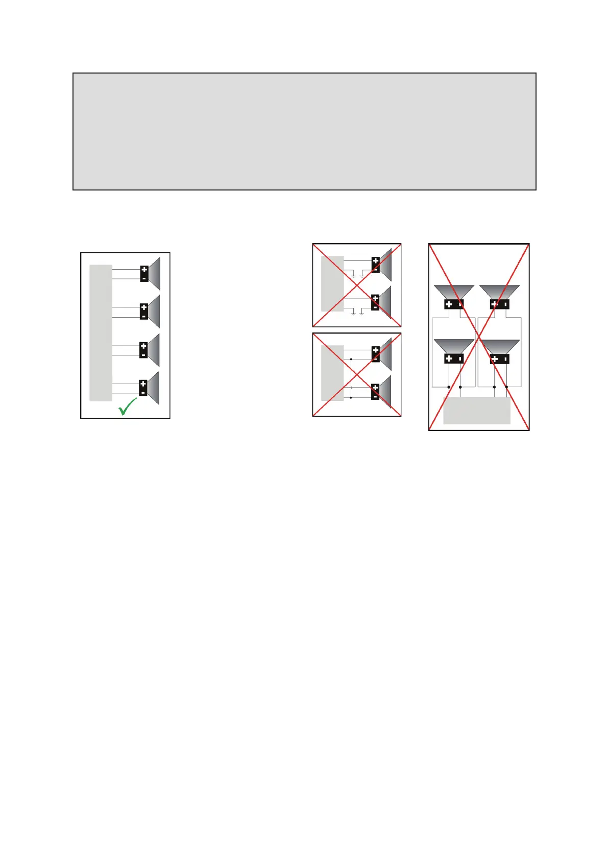 Connect the speakers according the following diagram, incorrect connections will damage the unit or your loudspeakers and