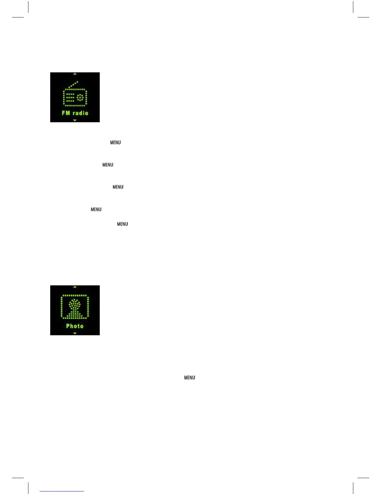 In Main interface, short press / or +/- to select Photo menu, then short press button to enter