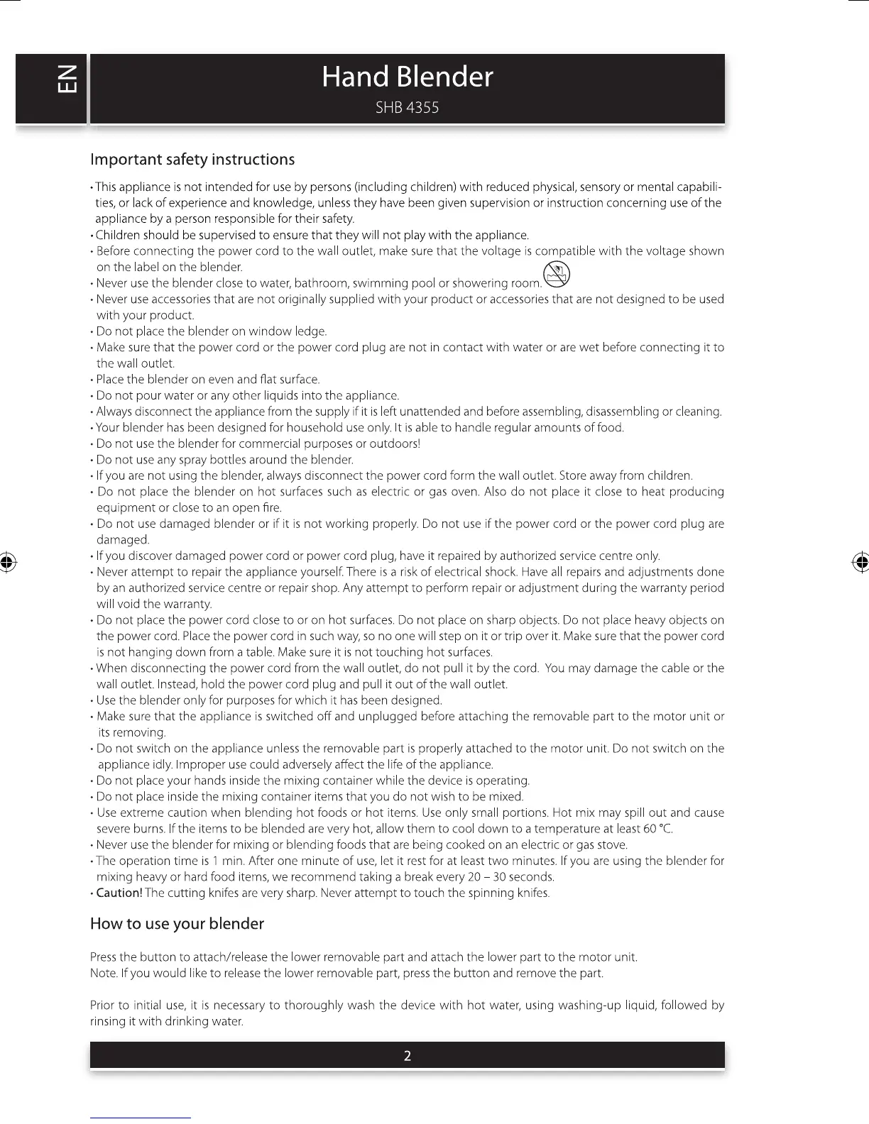 Sencor SHB 4355 - Important Safety Instructions; General Usage Precautions; Operational Guidelines; Handling Hot Foods