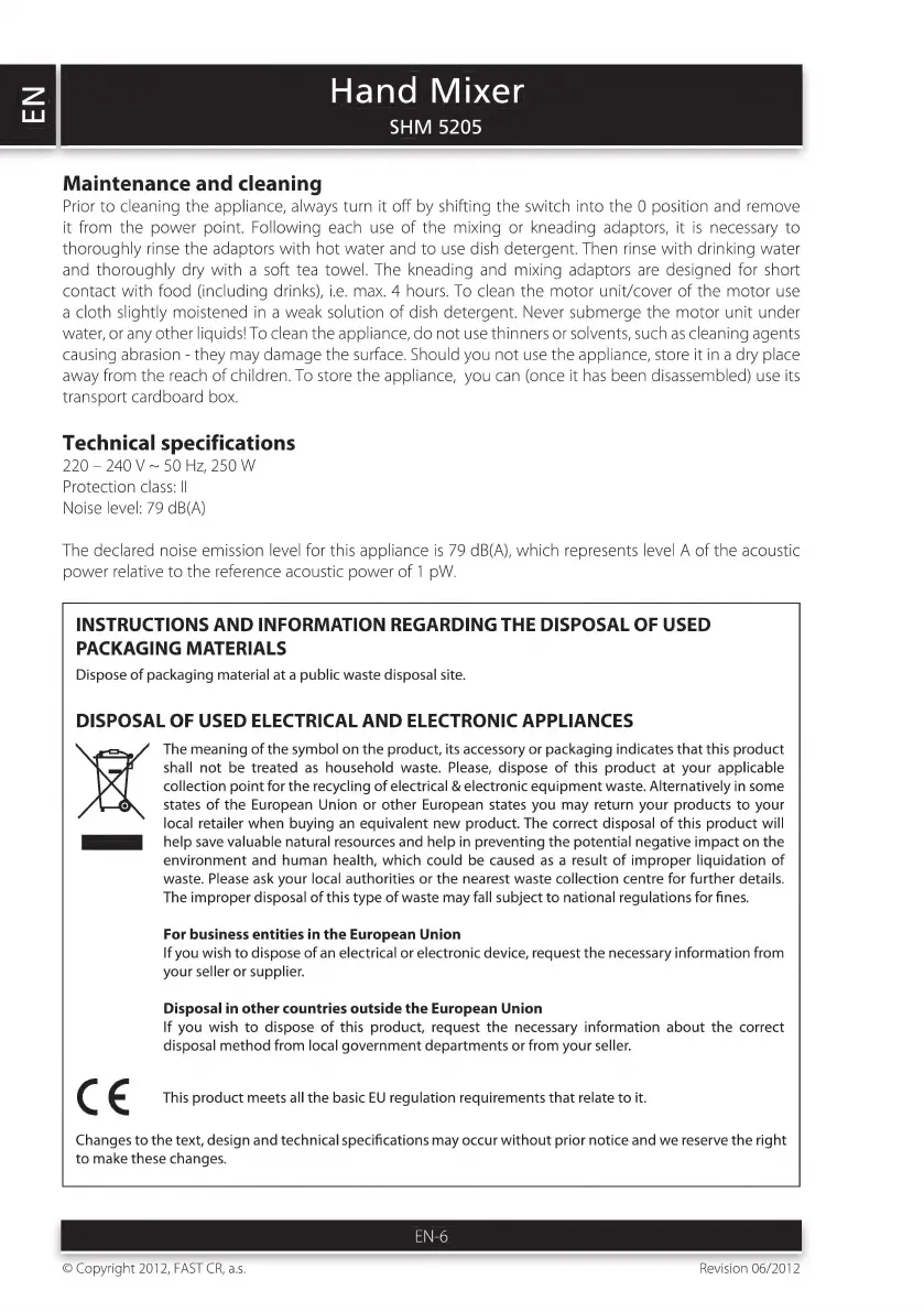 Sencor SHM 5205 - Maintenance and Cleaning; Technical Specifications; Instructions and Information Regarding the Disposal of Used Packaging Materials; Disposal of Used Electrical and Electronic Appliances