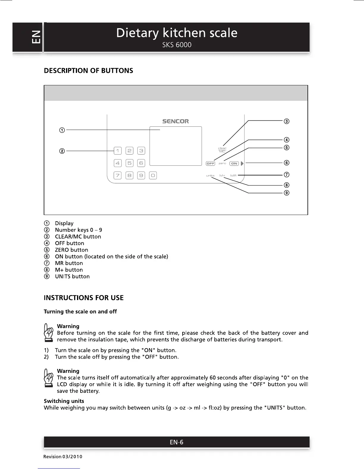 Sencor SKS 6000 - DESCRIPTION OF BUTTONS; INSTRUCTIONS FOR USE; Turning the scale on and off; Switching units