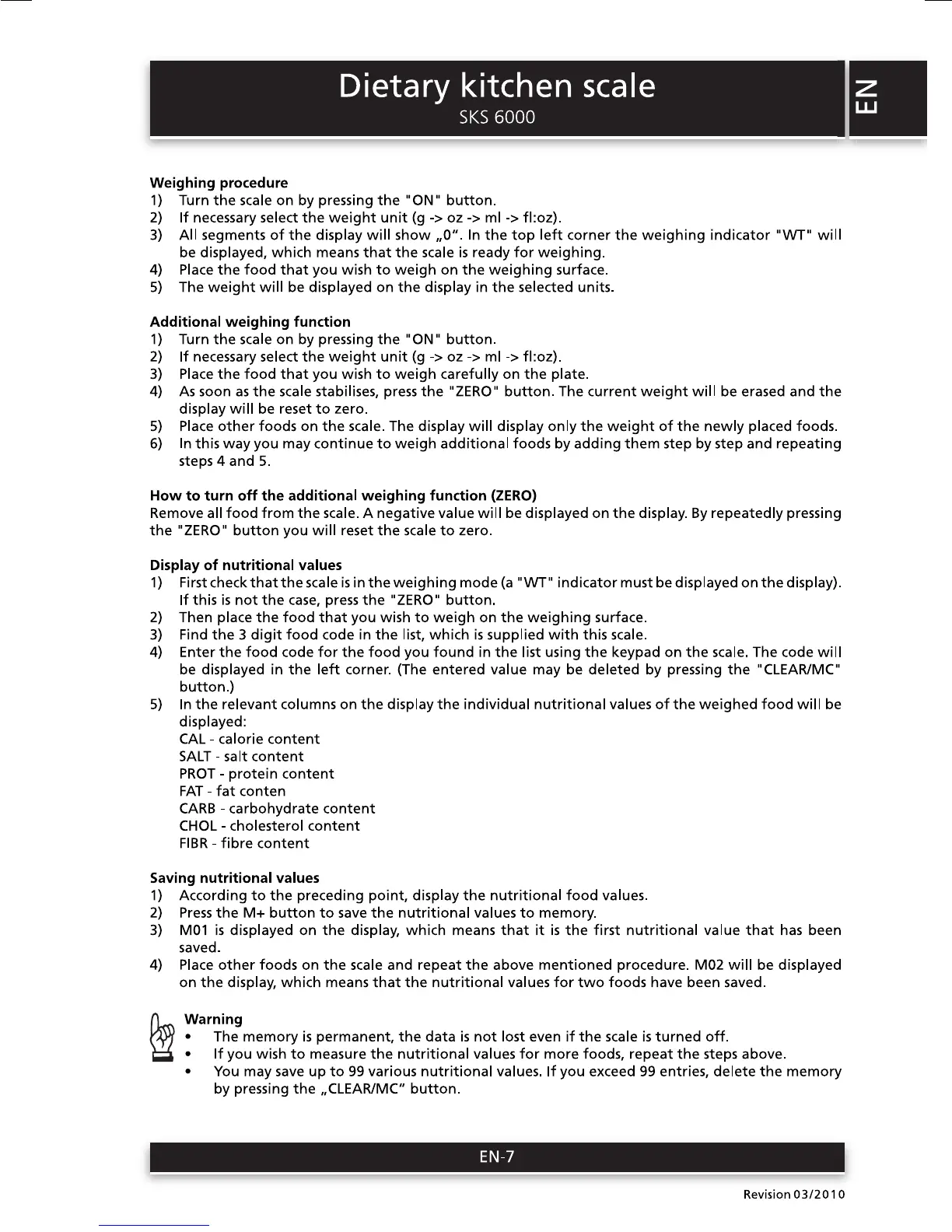 Sencor SKS 6000 - Weighing procedure; Additional weighing function; Zeroing for additional weighing; Displaying nutritional values