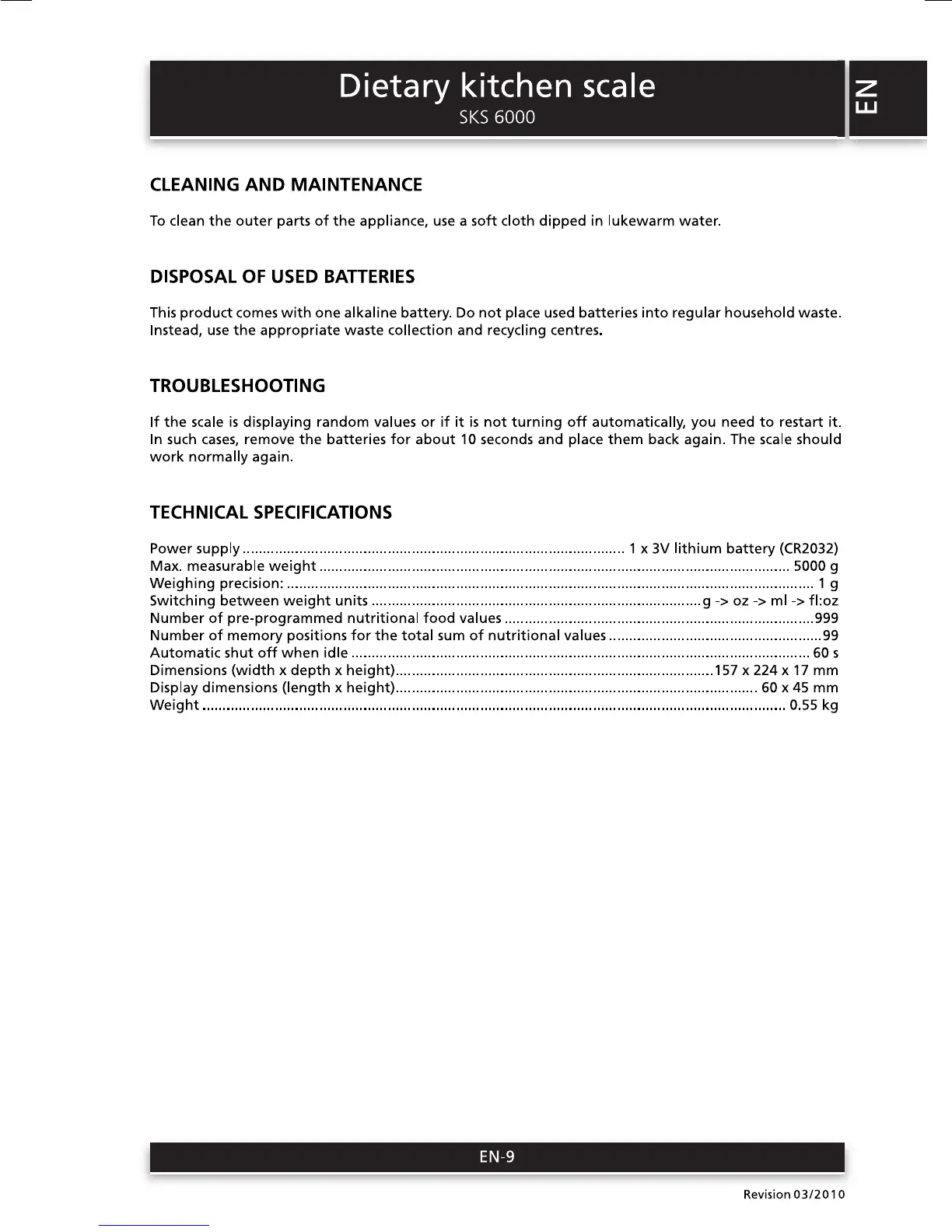 Sencor SKS 6000 - CLEANING AND MAINTENANCE; DISPOSAL OF USED BATTERIES; TROUBLESHOOTING; TECHNICAL SPECIFICATIONS