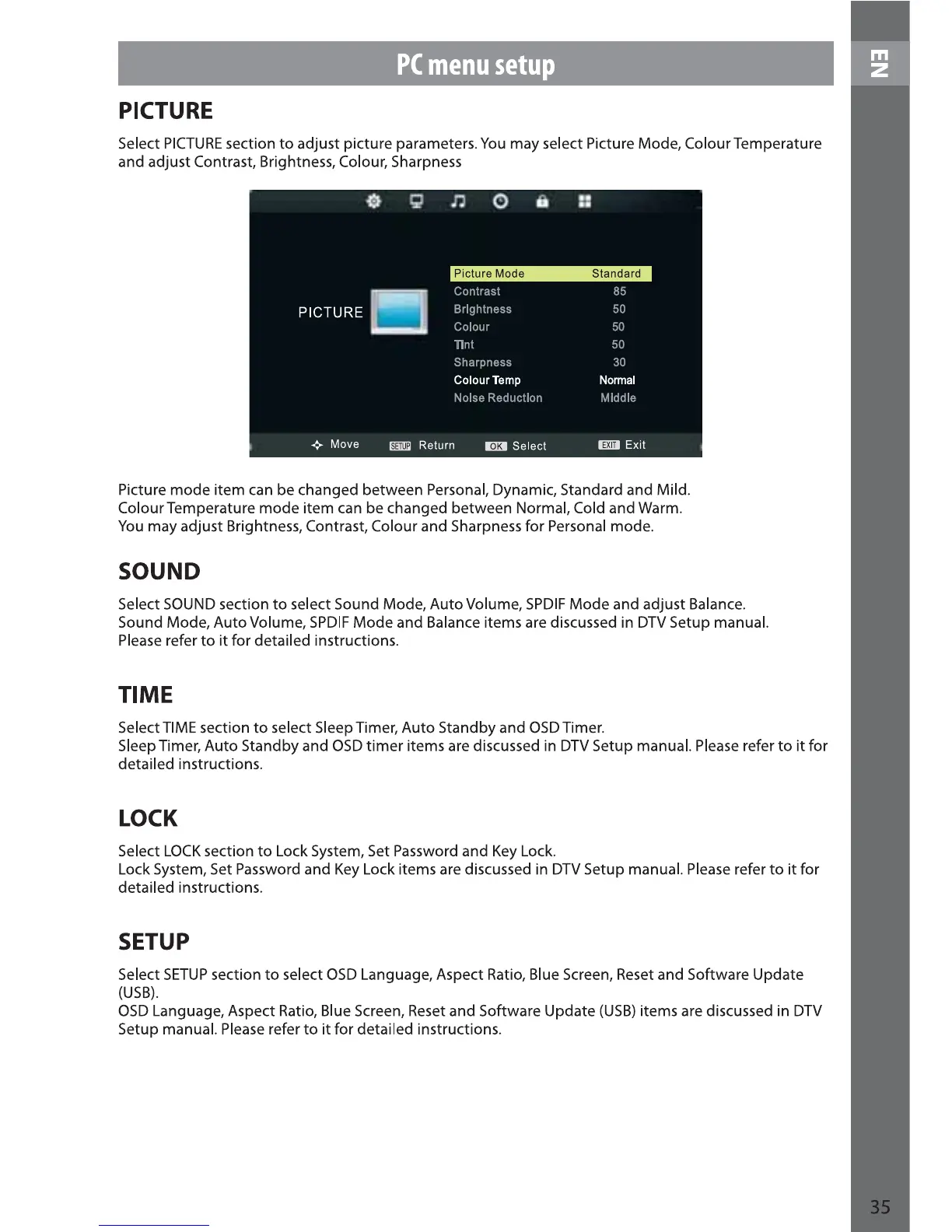 Sencor SLE 22F46DM4 - PC Picture, Sound, Time, Lock, Setup Settings