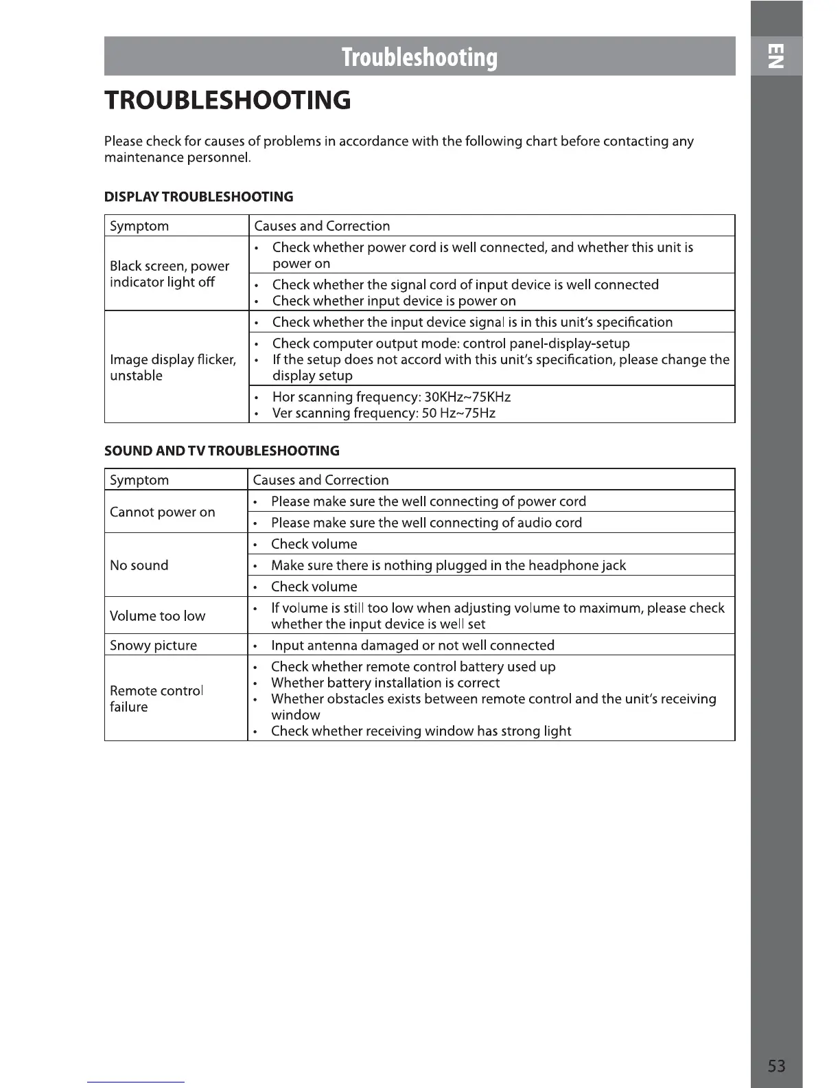 Sencor SLE 22F46DM4 - Troubleshooting; Display Troubleshooting; Sound and TV Troubleshooting