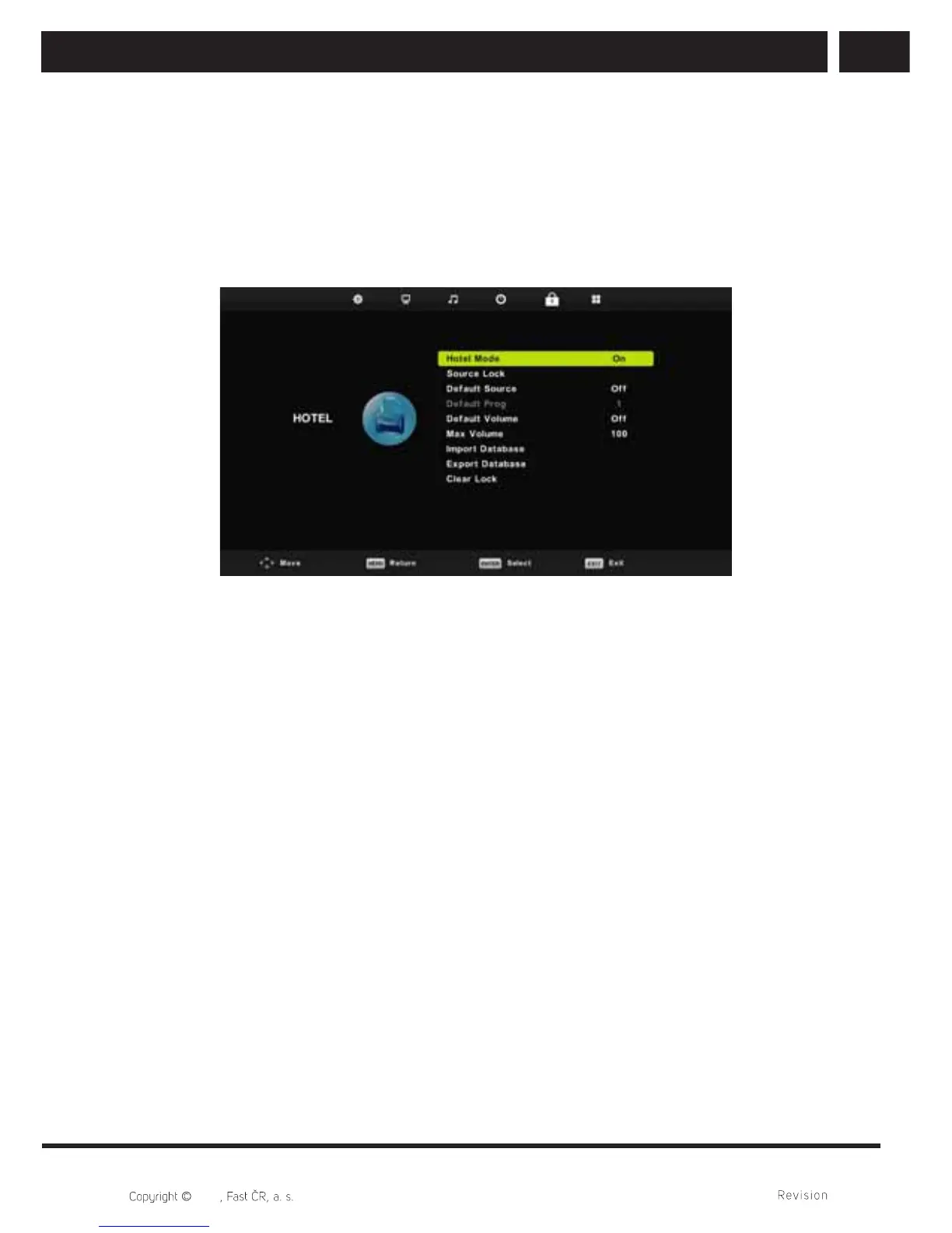 1. Press / button on the remote control to select hotel mode in the Lock menu.
