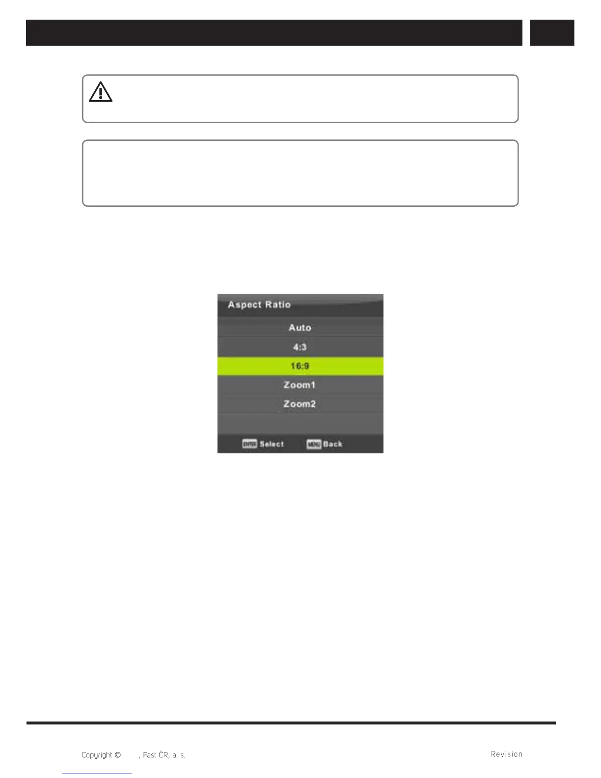 Press / button to select aspect ratio. (Available options are: Auto, 4:3, 16:9, Zoom1,