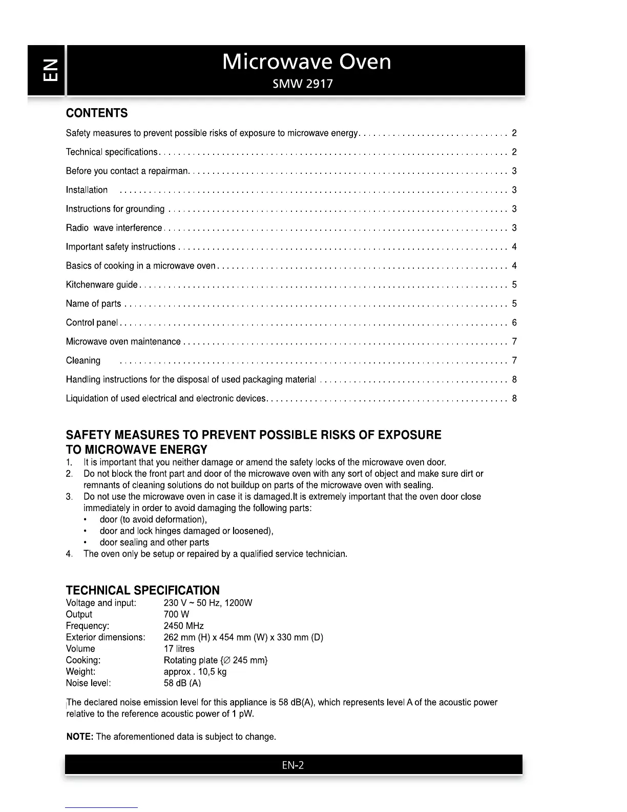 Sencor SMW 2917 - Safety Measures to Prevent Possible Risks of Exposure to Microwave Energy; Technical Specification