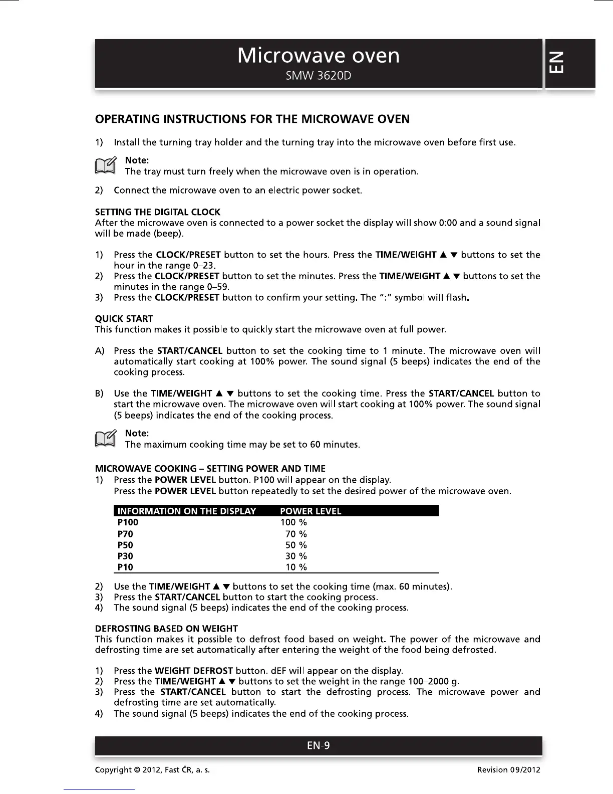 Sencor SMW 3620D - OPERATING INSTRUCTIONS FOR THE MICROWAVE OVEN; Initial Setup; Setting the Digital Clock; Quick Start Function