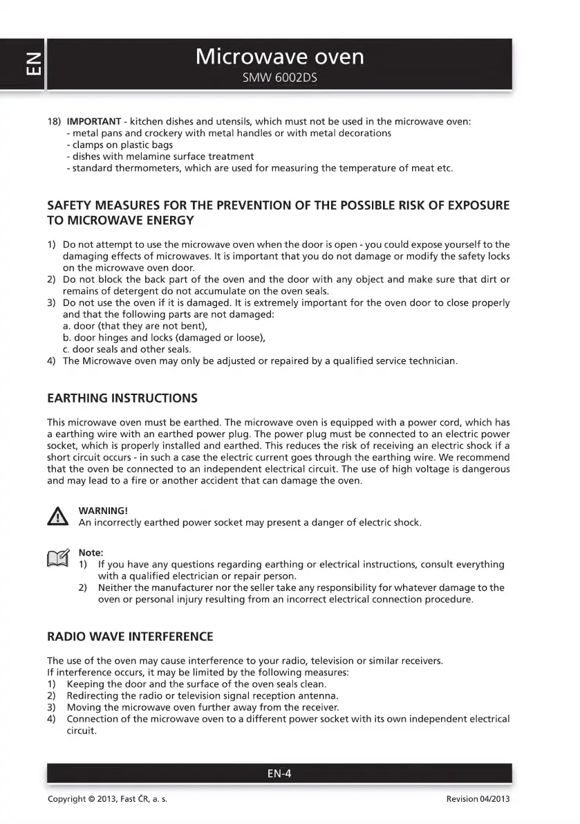 Sencor SMW 6002DS - Earthing Instructions; Radio Wave Interference