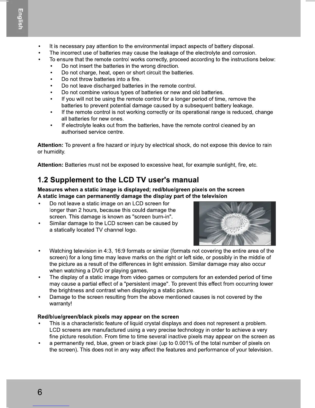 Sencor SPV 2750 - Supplement to the LCD TV Users Manual; Measures When a Static Image Is Displayed; Red;Blue;Green;Black Pixels May Appear on the Screen