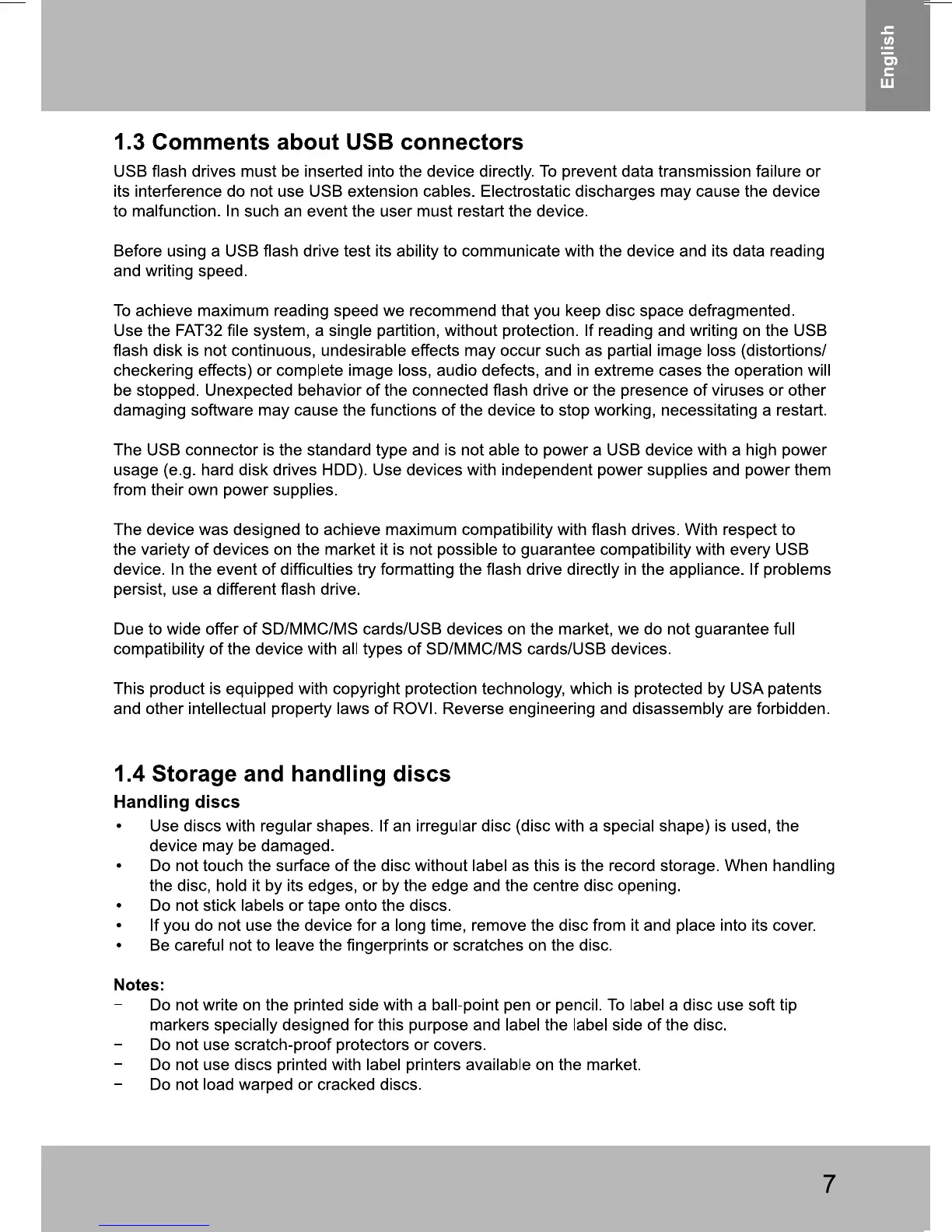 Sencor SPV 2750 - Comments about USB Connectors; Storage and Handling Discs