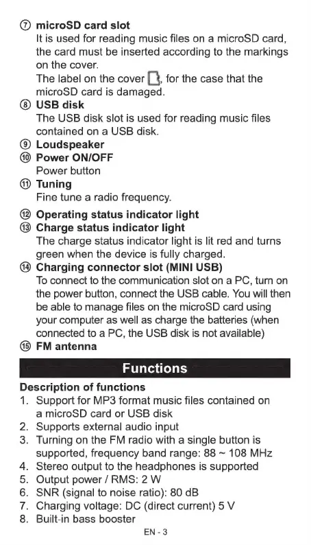 Sencor SRD 215 B - Device Functions and Specifications; Supported Media Formats; Audio Input and Output; FM Radio Range