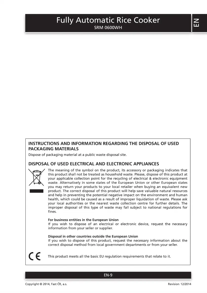 Sencor SRM 0600WH - Instructions Regarding Disposal of Used Packaging Materials; Disposal of Used Electrical and Electronic Appliances
