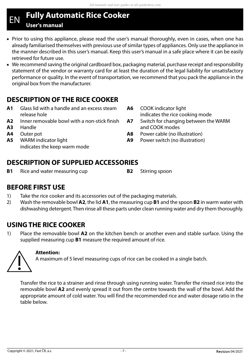 appropriate amount of cold water. You will find the recommended rice and water dosage ratio in the
