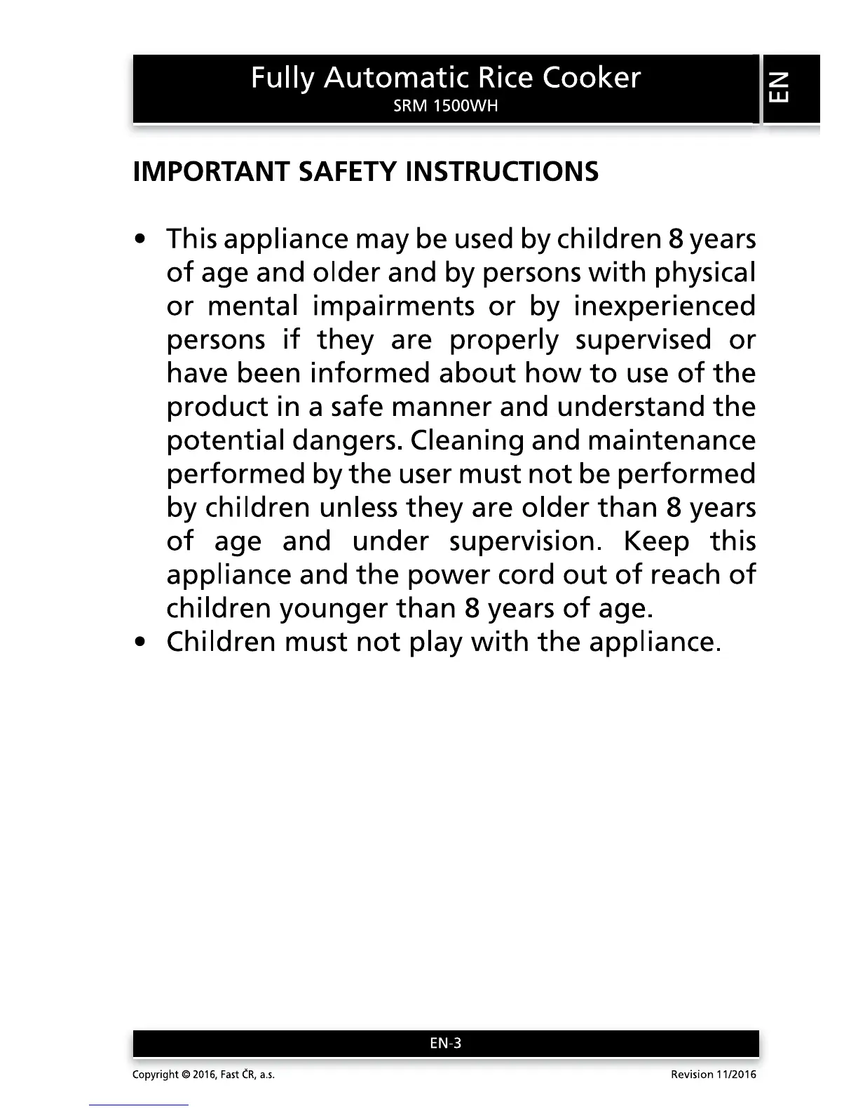 Sencor SRM 1500WH - Important Safety Instructions; User Age and Supervision; Prohibition of Play