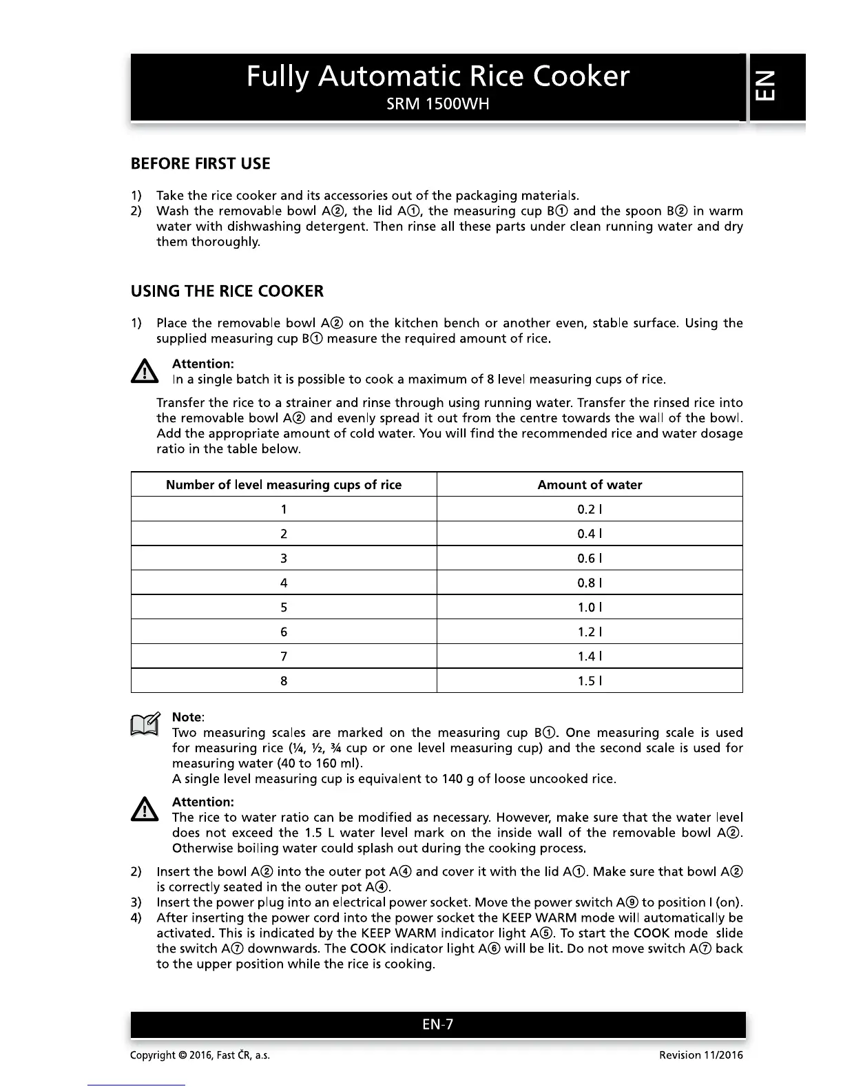 Sencor SRM 1500WH - Before First Use; Unpacking and Initial Cleaning; Using the Rice Cooker; Preparation and Rice Measurement
