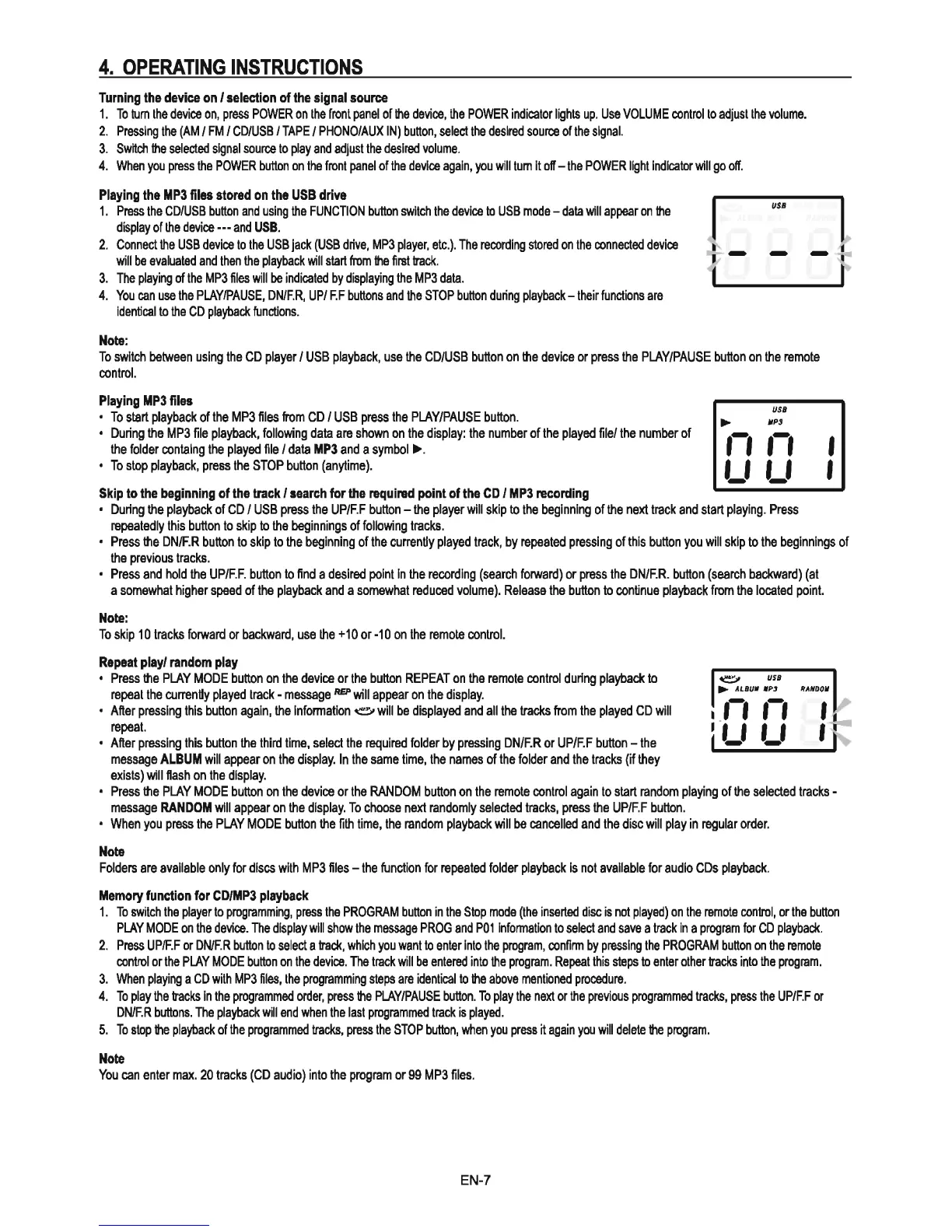 Sencor STT016 - Operating Instructions: MP3 and Navigation; Playing MP3 Files from USB and CD; Track Navigation and Playback Modes