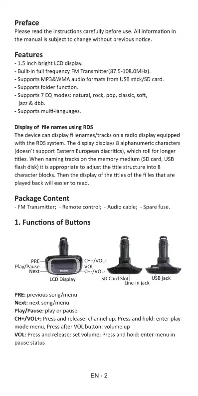 Sencor SWM 170 RDS - Package Content; Functions of Buttons