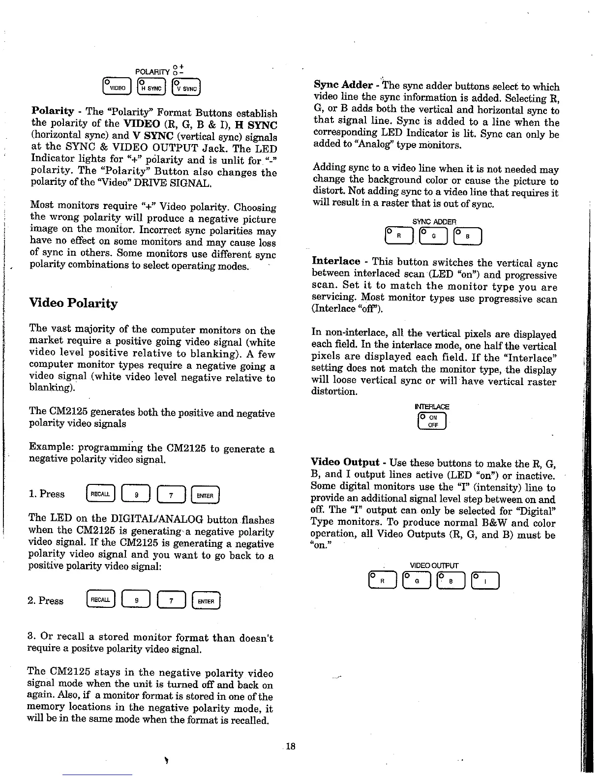 Sencore cm2125 - Video Polarity; Interlace; Video Output