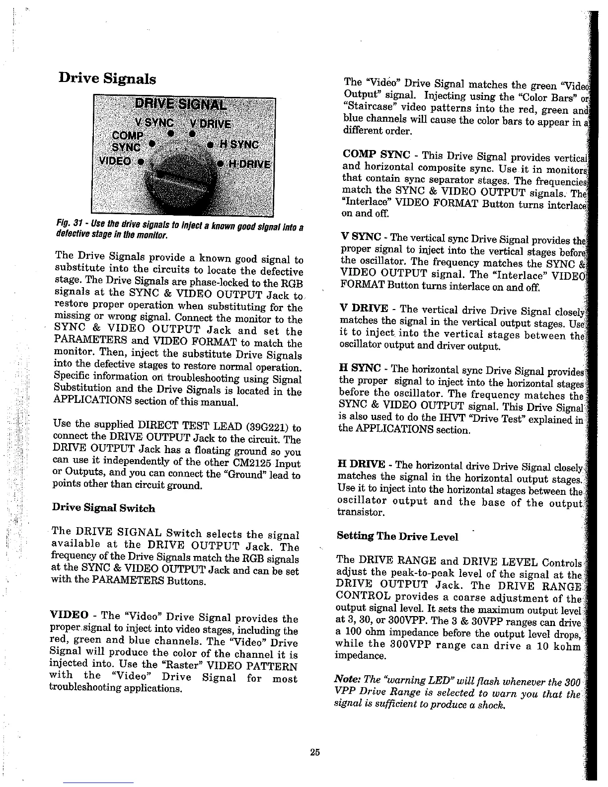 Sencore cm2125 - Drive Signals; Drive Signal Switch; Setting the Drive Level; V Drive