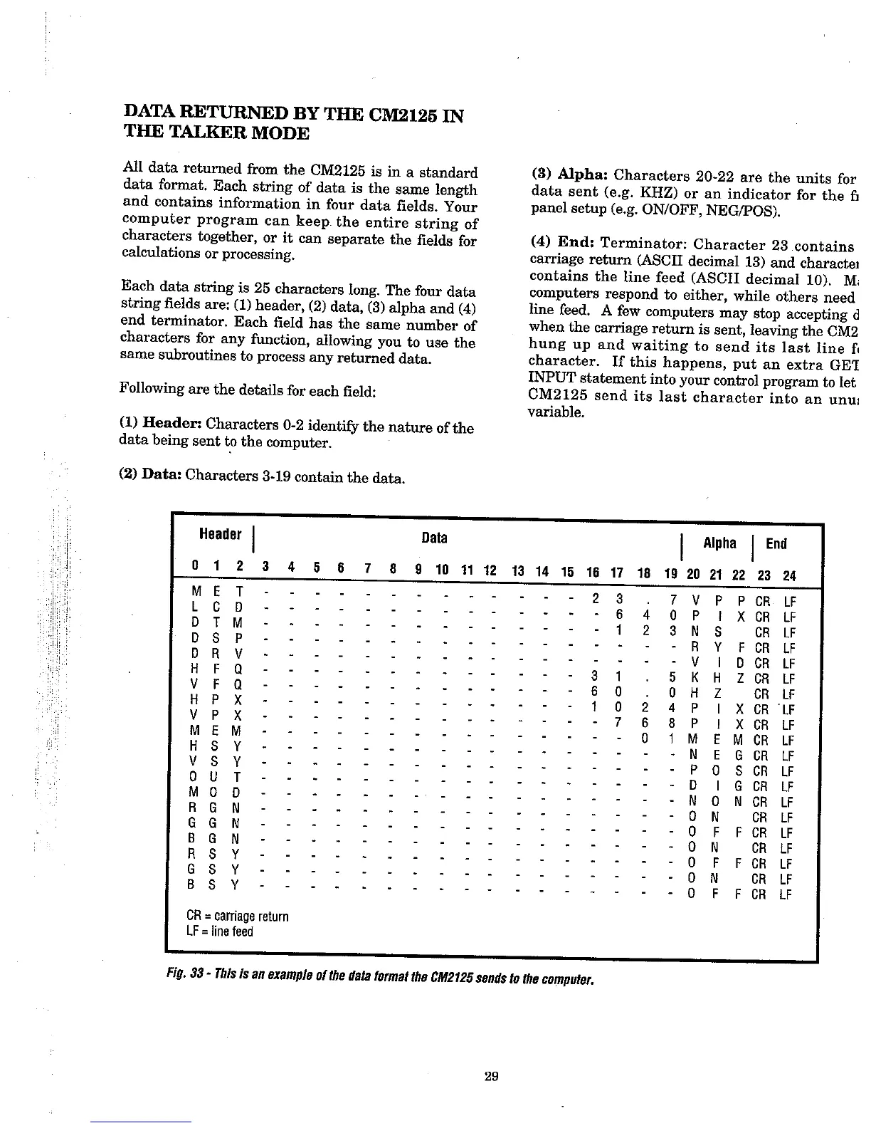 Sencore cm2125 - Data Returned by the CM2125 in the Talker Mode; Header; Data; Alpha