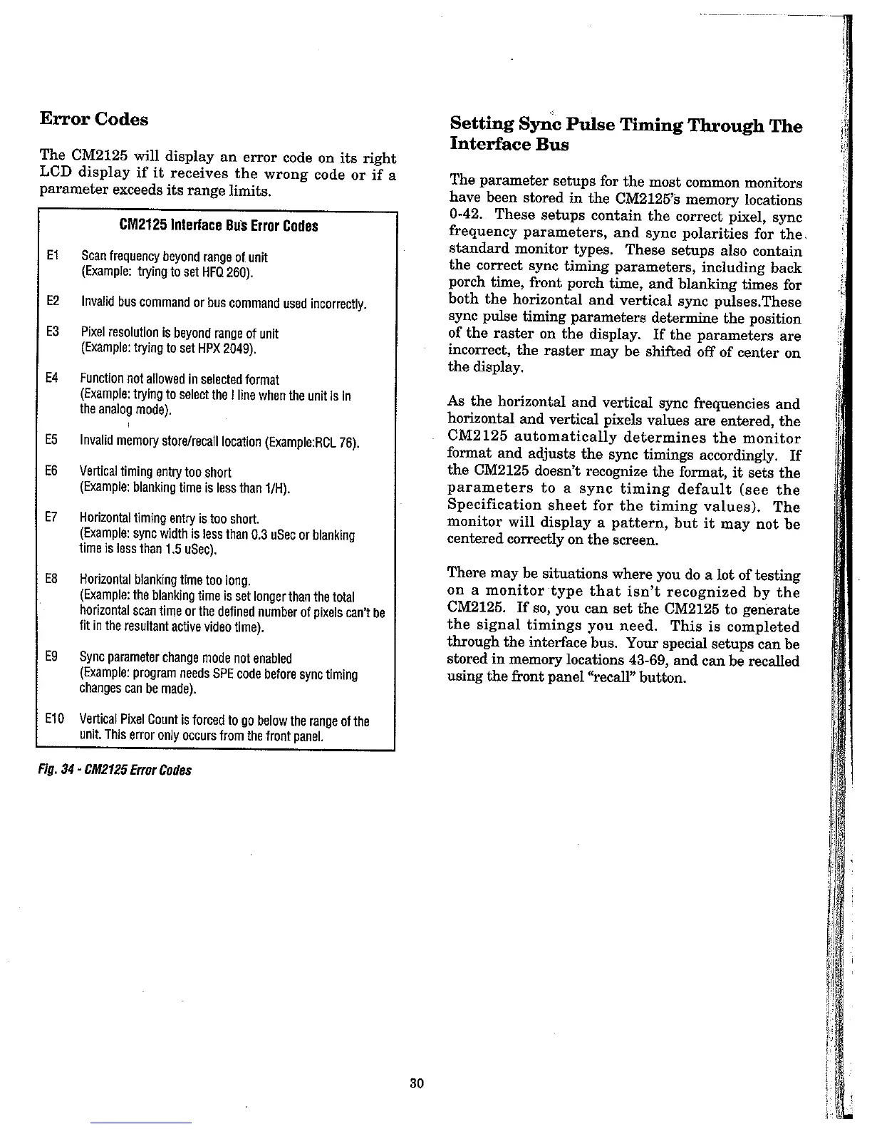 Sencore cm2125 - Error Codes; CM2125 Interface Bus Error Codes; Settings Sync Pulse Timing through the Interface B Us