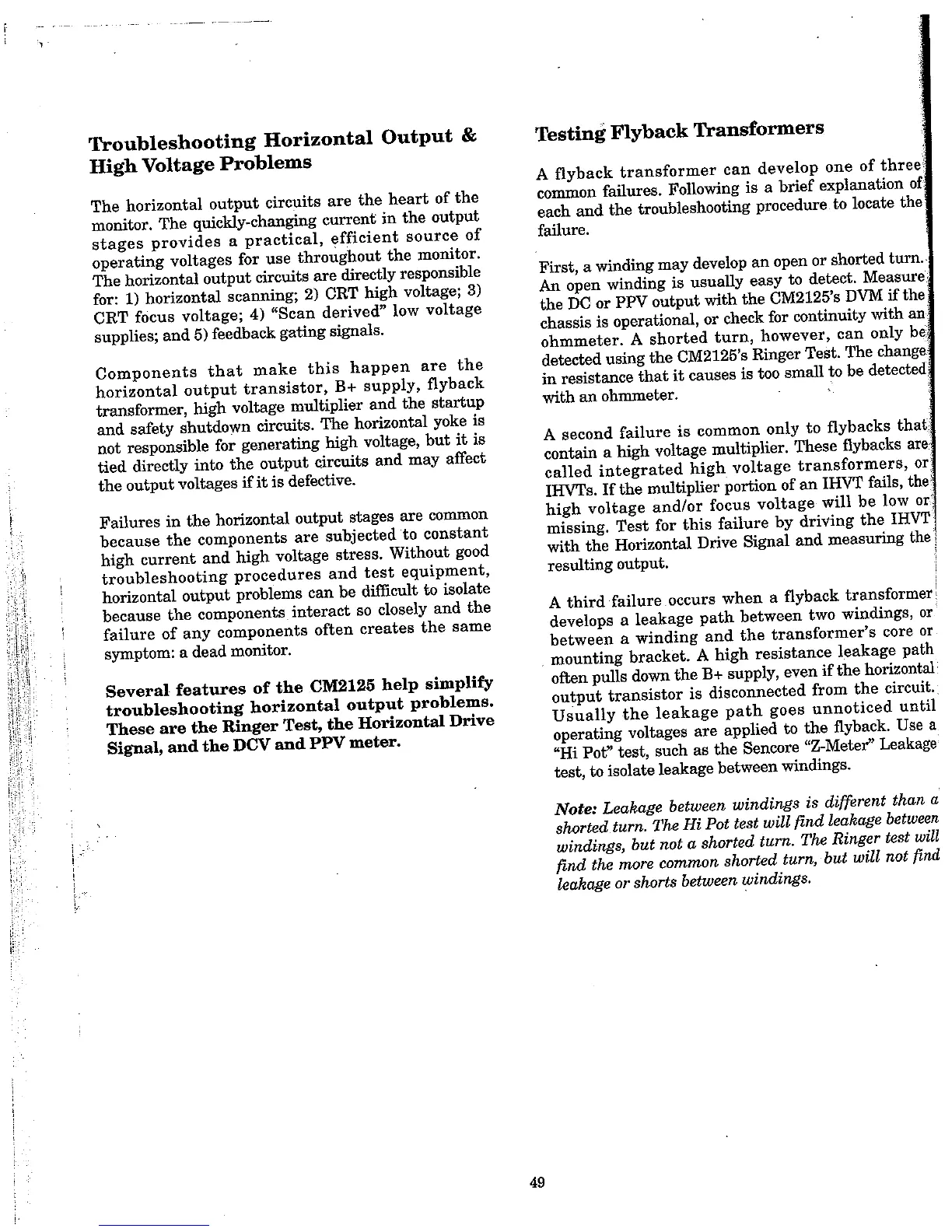 Sencore cm2125 - Troubleshooting Horizontal Output & High Voltage Problems; Testing Flyback Transformers
