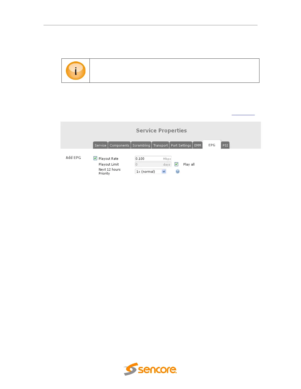 The EPG tab enables transmission of EIT schedule information on a particular output stream, if