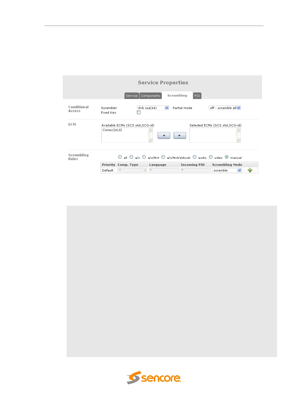 The Scrambling tab handles all aspects of encryption apart for the EMM which is handled by a