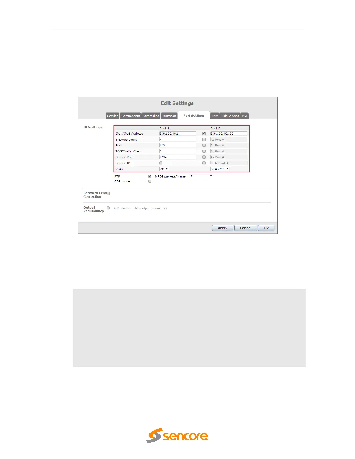IP settings can be configured different on the two IP ports in cloned output mode. Parameters