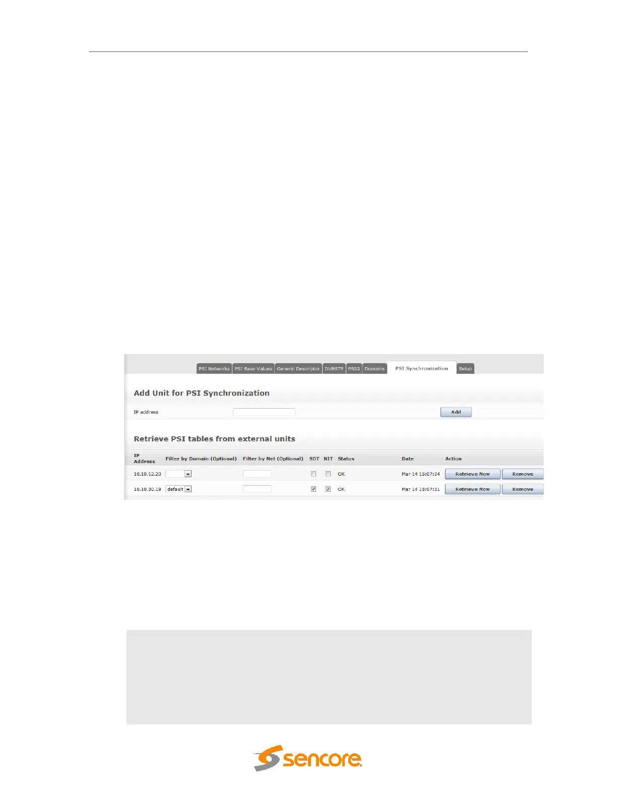 PSI Synchronization allows the operator to synchronize NIT and/or SDT tables between units