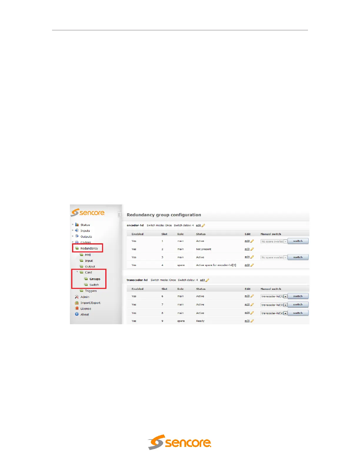 All redundancy configurations are performed from the Redundancy->Card navigation pane.