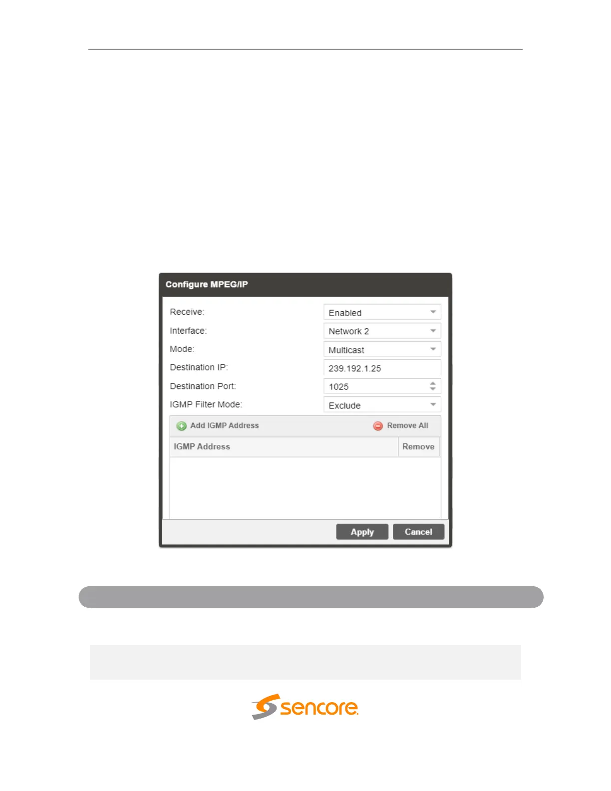 This menu configures the MPEG/IP input for reception of unicast or multicast transport