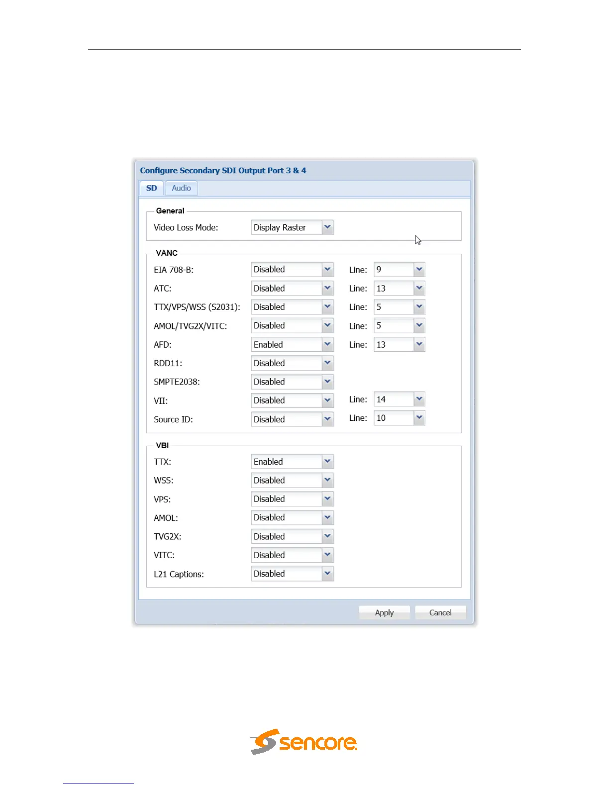 in the secondary, simultaneous SDI video output. All VANC embedding Line settings