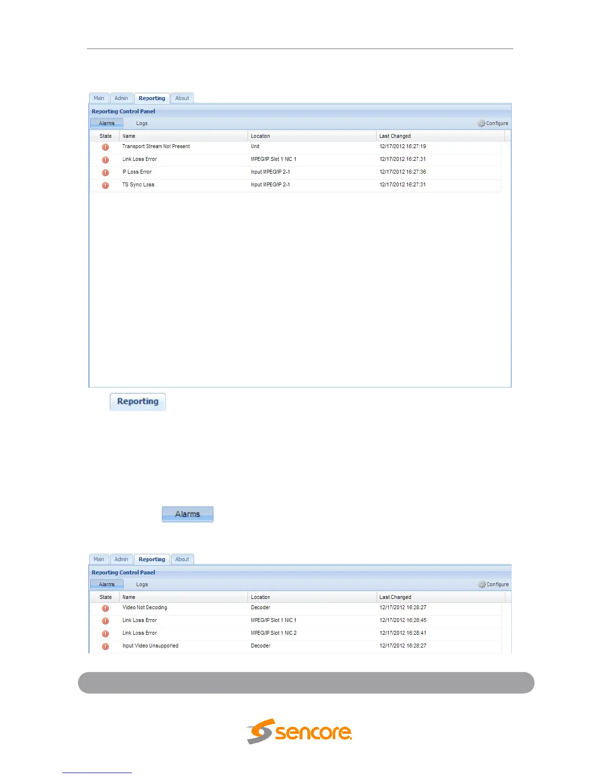 the unit and an event log. The active alarms are updated periodically in order to reflect