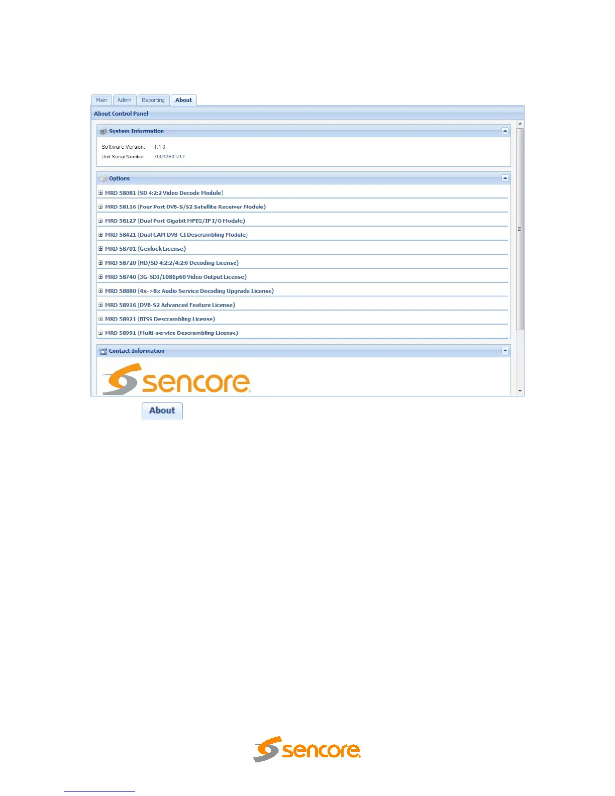 Sencore MRD 5800 - About Panel