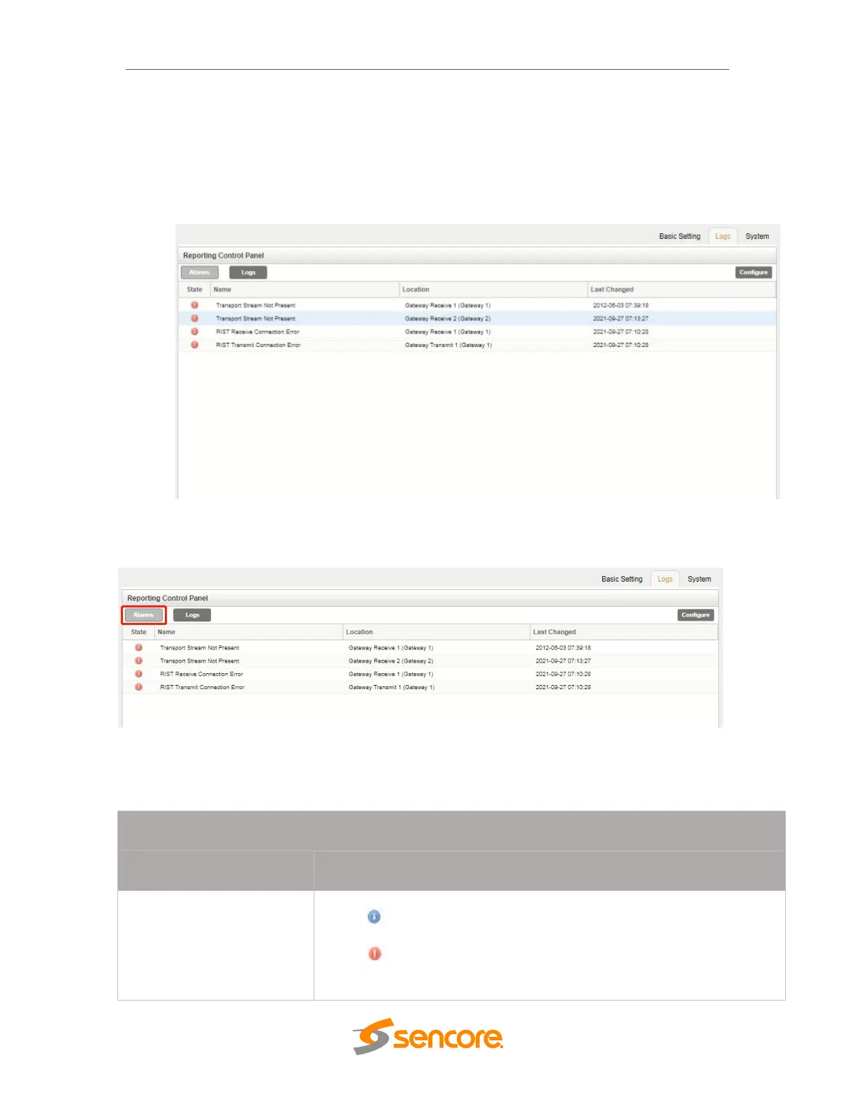 Clicking on the Alarms button displays the Active Alarms menu. This list displays all of