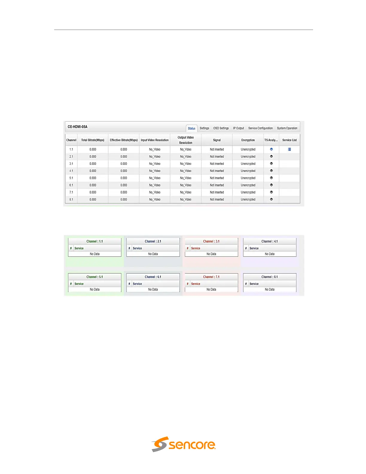 input and output Resolution, TS analysis and Service list in each channel as shown in
