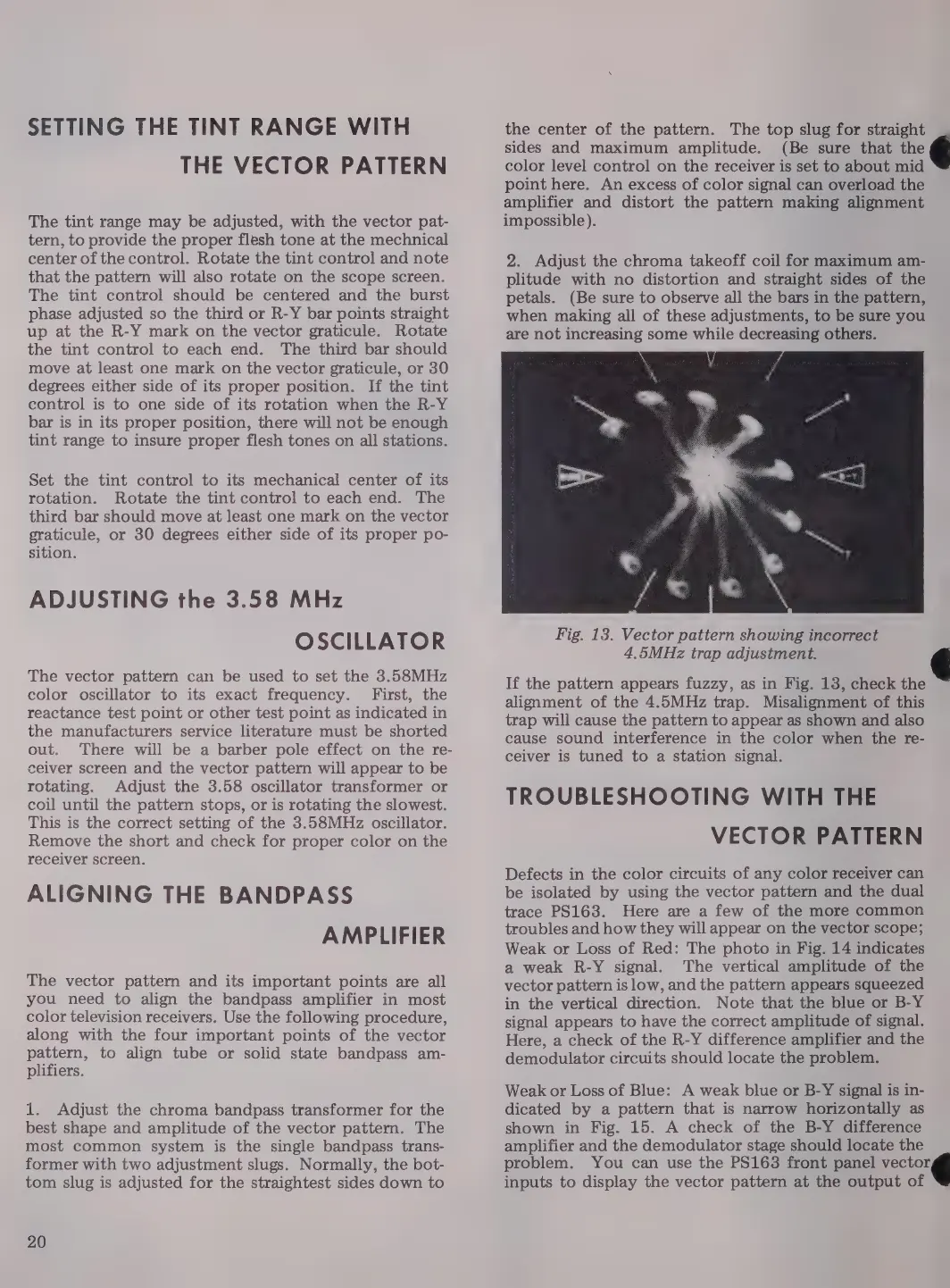 Sencore PS163 - SETTING THE TINT RANGE WITH THE VECTOR PATTERN; ADJUSTING the 3.58 MHz OSCILLATOR; ALIGNING THE BANDPASS AMPLIFIER; TROUBLESHOOTING WITH THE VECTOR PATTERN