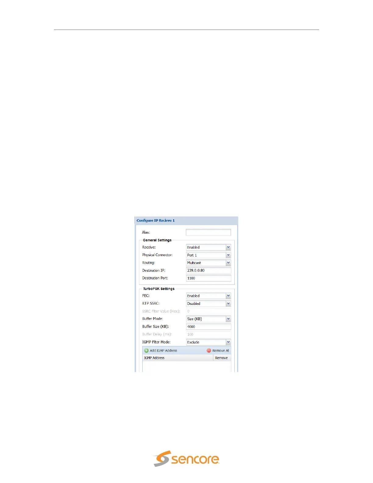 The Configure IP Receive menu permits user definition of the receive characteristics of that input.