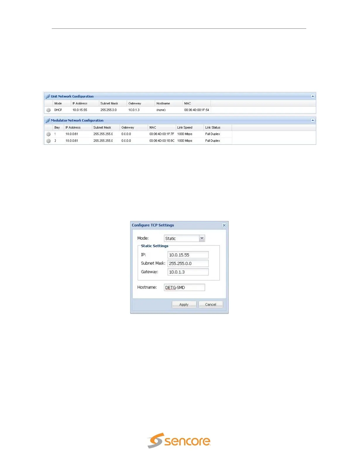 Network Configuration” shows the management port’s settings. The current status is shown,