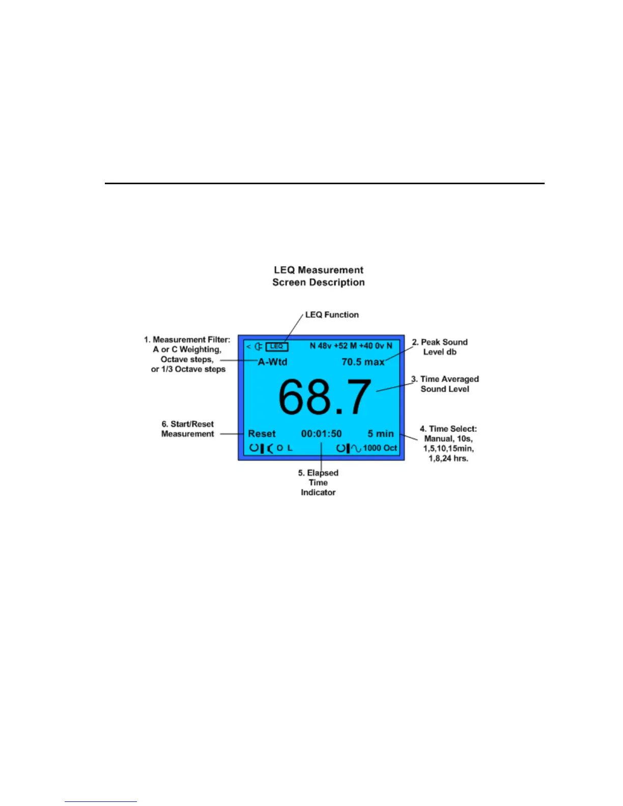 5. Elapsed Time - This field shows the time that the input sound level has been averaged,