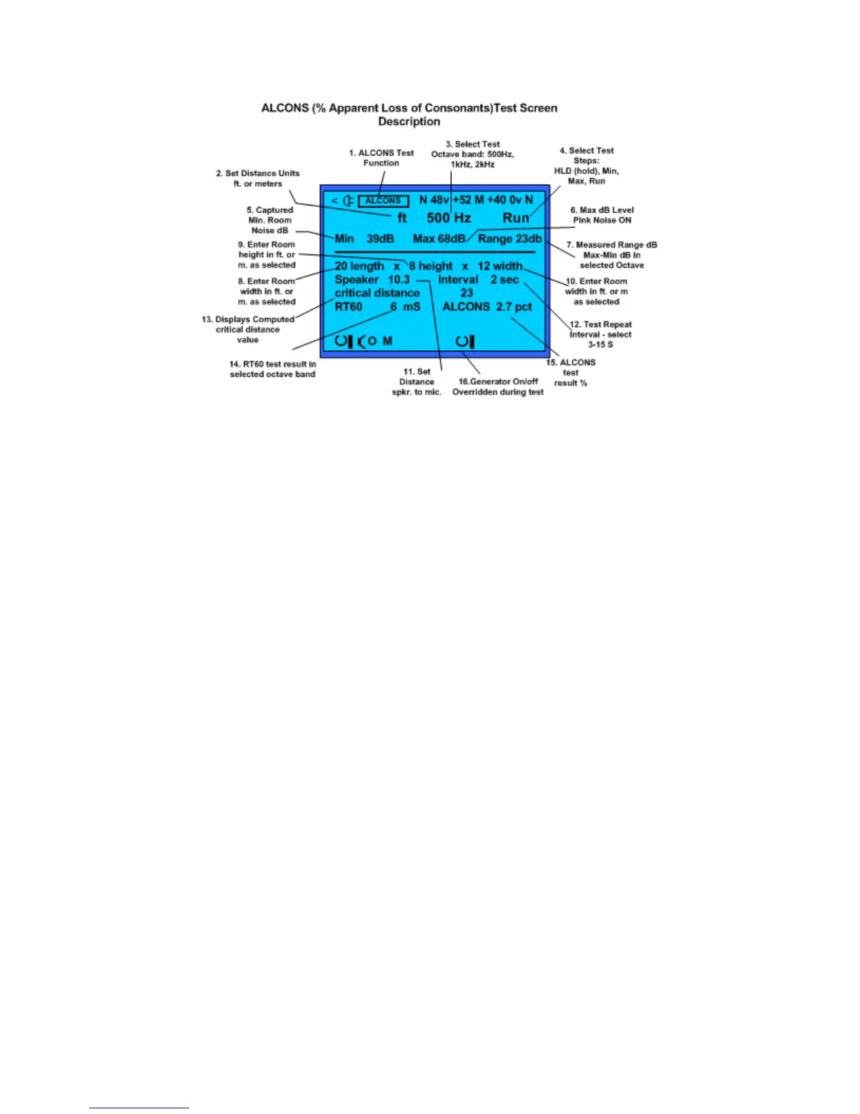 The ALCONS test screen & control fields: