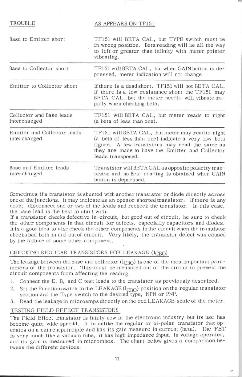 Sencore TF151 - Checking Regular Transistor Leakage (ICBO); Leakage Measurement Procedure; Testing Field Effect Transistors (FETs)