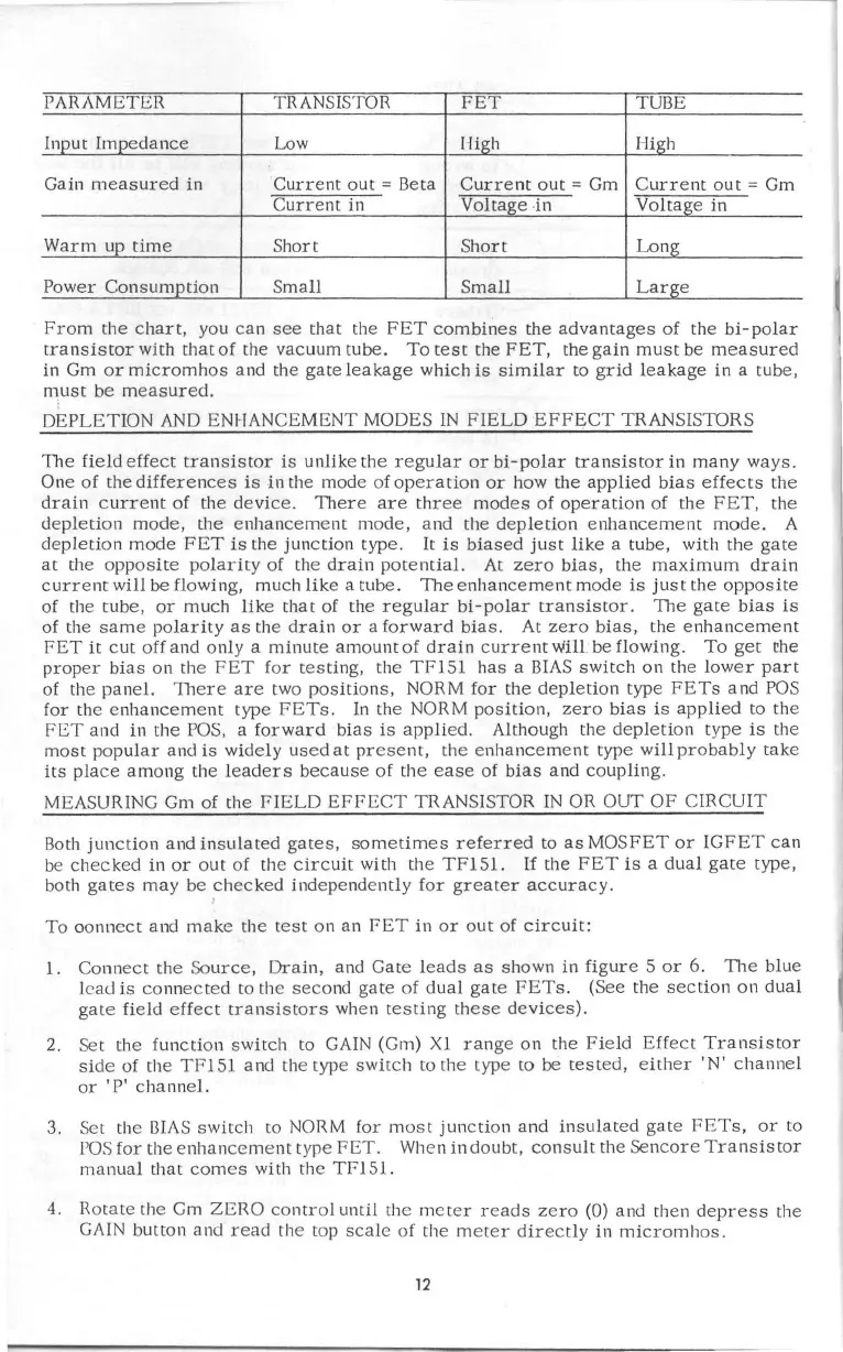 Sencore TF151 - FET Modes of Operation; Measuring FET Transconductance (Gm); Gm Measurement Setup and Procedure