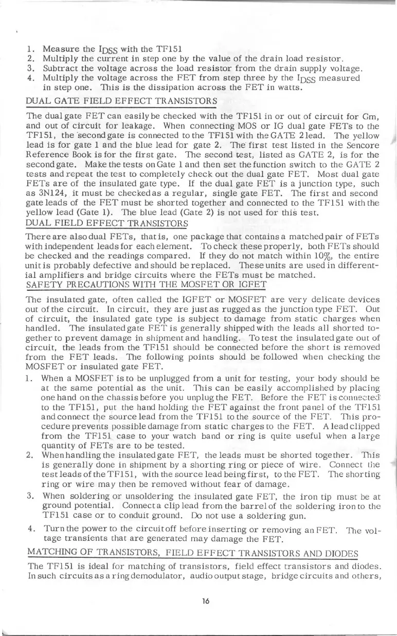 Sencore TF151 - Dual Gate FET Testing; Dual FETs (Matched Pairs); MOSFET;IGFET Safety Precautions; Handling and Testing Precautions