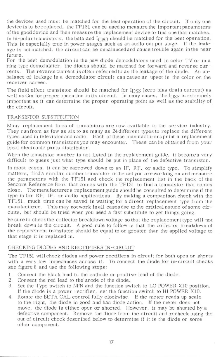 Sencore TF151 - Matching Components; Transistor Substitution Guidance; Checking Diodes and Rectifiers In-Circuit; In-Circuit Diode Test Procedure