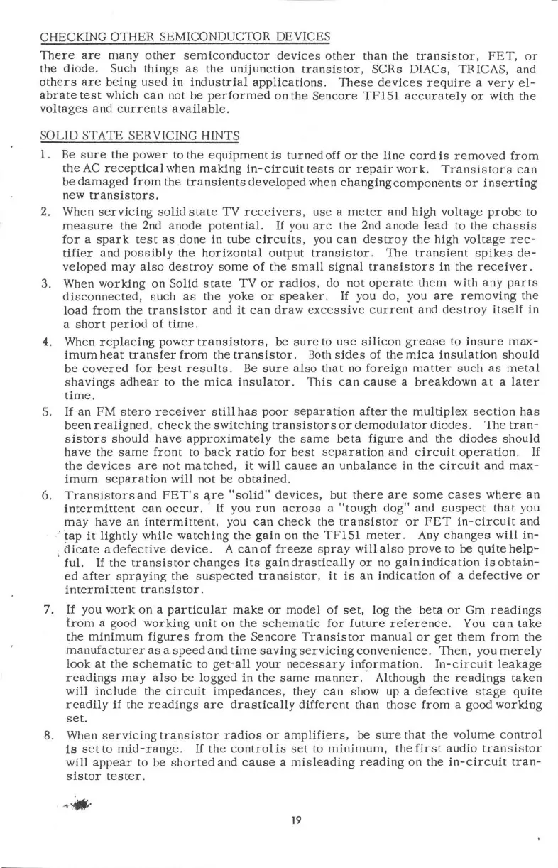 Sencore TF151 - Other Semiconductor Devices; Solid State Servicing Hints