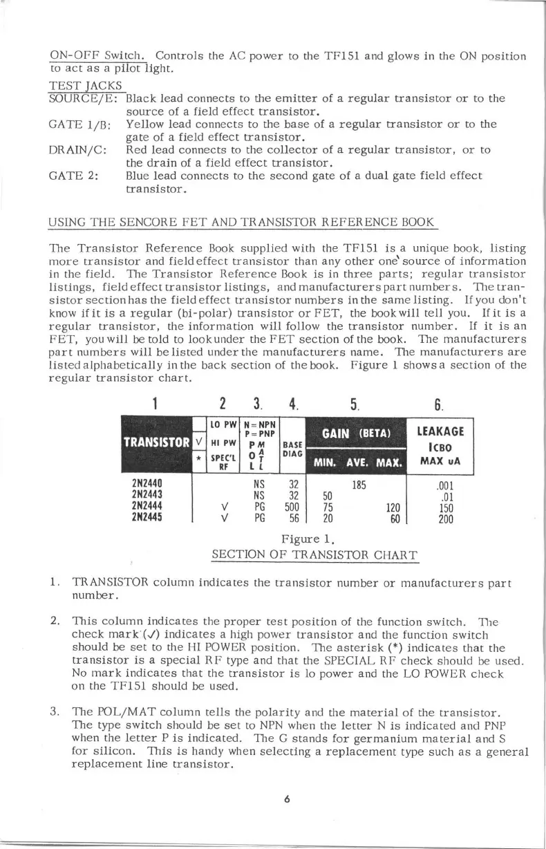 Sencore TF151 - Test Jacks and Connections; Transistor Chart Columns Explained